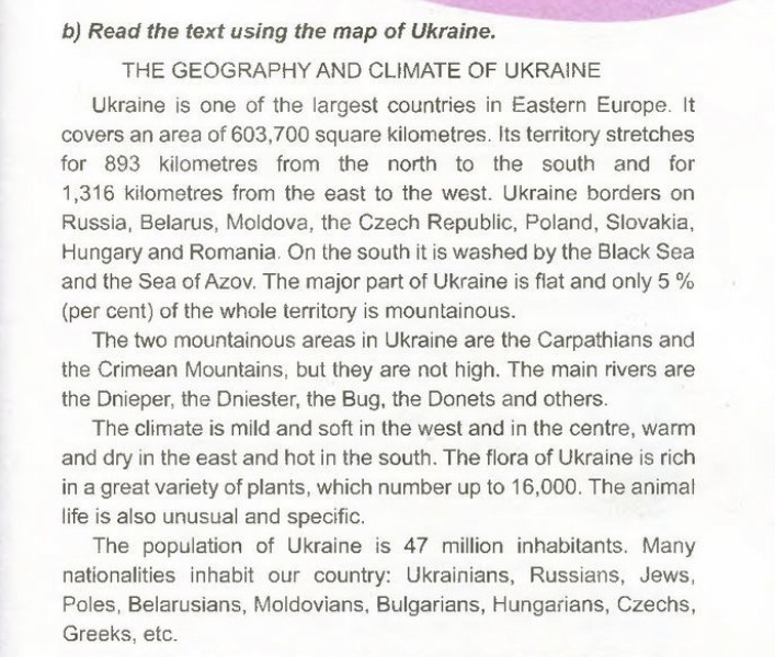 В України є дві гірські області – Карпати та Кримські гори, але вони не високі, але вони не високі. Головними річками – Дніпро, Днестр, Буг, Донец та інші.