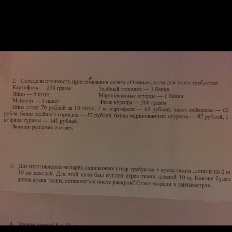 4) 15+35+62+57+87+70=326 (руб) стоимость приготовления салата Оливье