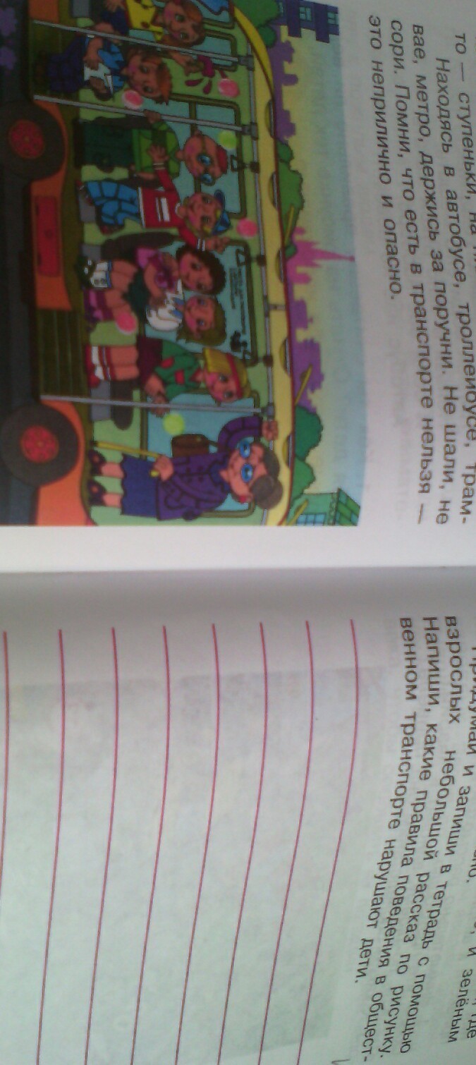придумай и запиши в тетрадь с помощью взрослых небольшой рассказ по рисунку напишите какие правила поведения в общественном транспорте нарушают дети.
