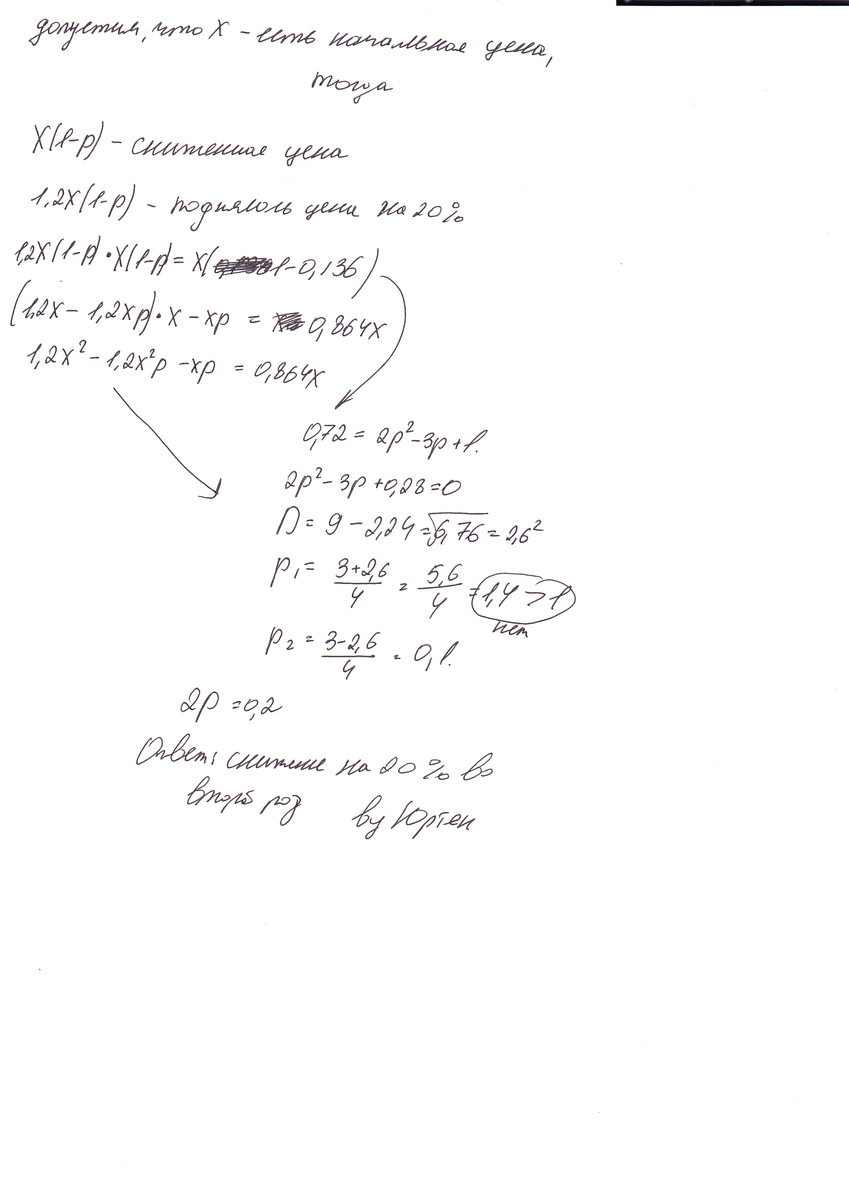 В результате колебания цен на рынке цена пакета акций сначала понизилась на р%, затем поднялась на 20%, а затем снизилась на 2р%. В итоге начальная цена пакета акций снизилась на 13,6%. На сколько процентов понизилась цена пакета акций во второй раз?