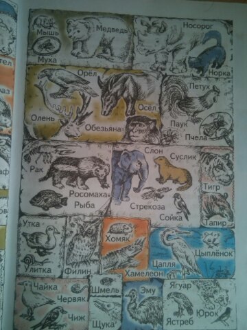 Медведь, орёл, олень, обезьяна, хамелеон, филин, суслик, стрекоза, цапля, улитка. (есть ещё 6: петух, тигр, тапир, цыплёнок, ястреб, шмель)