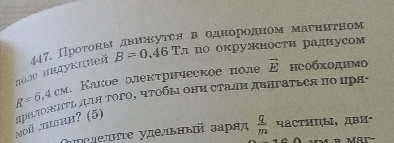 E=q*B²*R/m=1.6*10^-19*0.46²*0.064/(1.67*10^-27)=1.3*10^6 В/м