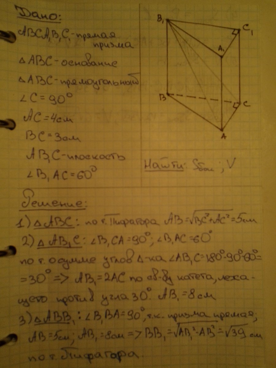 В основании прямой призмы ABCA1B1C1 лежит прямоугольный треугольник ACB, угол C=90 градусов, AC=4 см, BC = 3 см. Через сторону AC и вершину B1 проведена плоскость, угол B1AC =60 градусов. Найдите площадь боковой поверхности и объём.