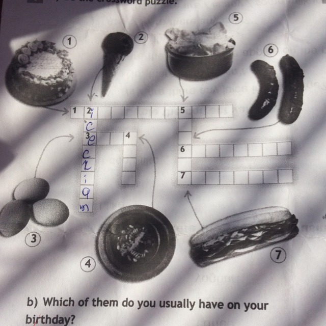 1. birthday cake 2. ice cream 3.eggs. 4. soup 5. crisps 6.sausages 7. sandwich