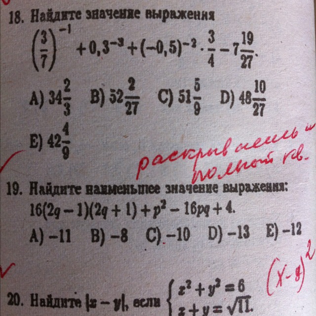 16(4q-1)+p²-16pq+4=64q-16+p²-16pq+4=(p-8q)²-12. Наименьшее значение квадрата (p-8q)² - это 0, тогда наименьшее значение (p-8q)²-12 - это 0-12=-12.