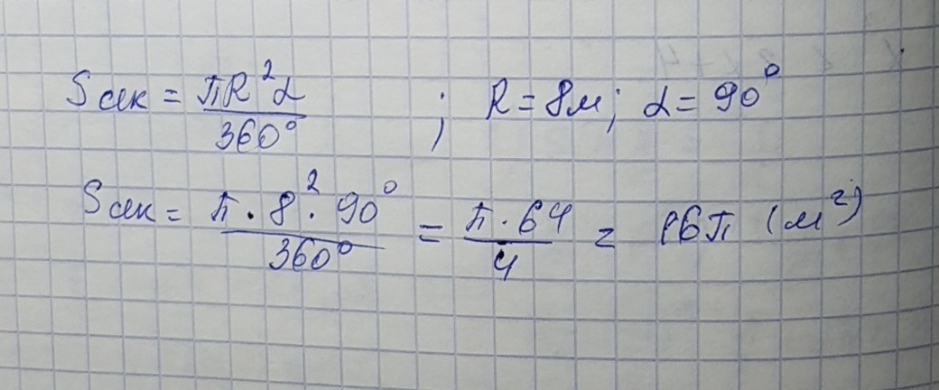 Вычислите площадь кругового сектора, если радиус круга 8м, а соответствующий центральный угол равен 90 градусов .