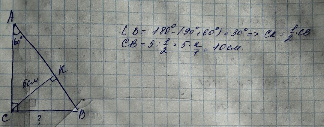 Угол В равен 30 градусов. Треугольник СКВ прямоугольный ,угол К равен 90 градусов, тк СК - высота. СК равно 1/2×СВ (катет, лежащий против угла в 30 градусов равен половине гипотенузы) . СВ равно 5÷1/2=5×2/1=10 см.