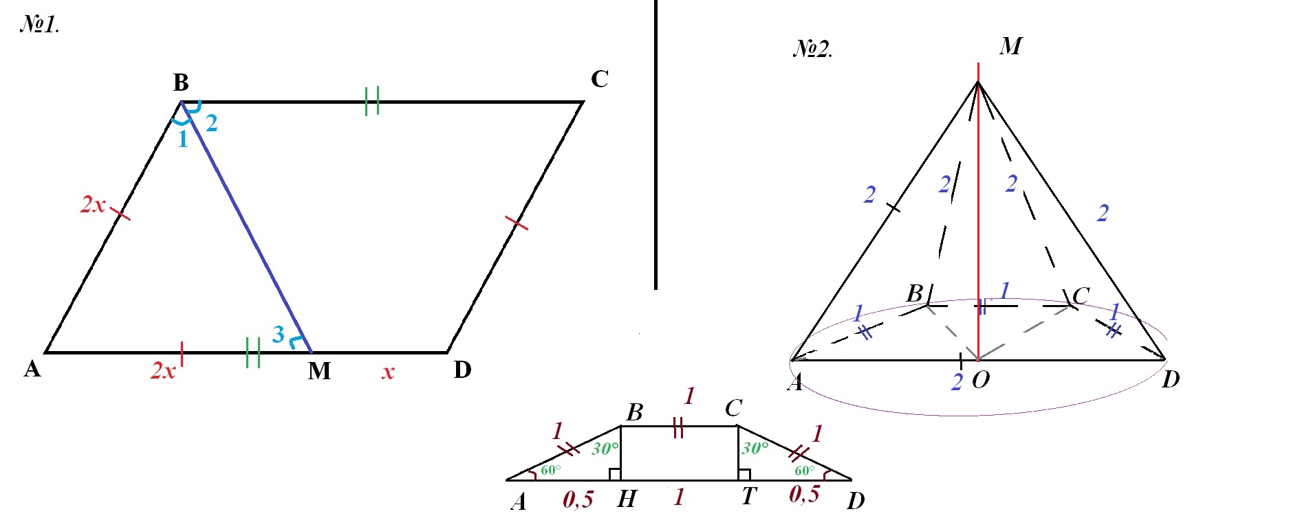 1) Проанализируем основание пирамиды -трапецию АВСД. Т.к. АВ=СД=1, то АВСД-равнобедренная. Проведем высоты ВН и СТ.