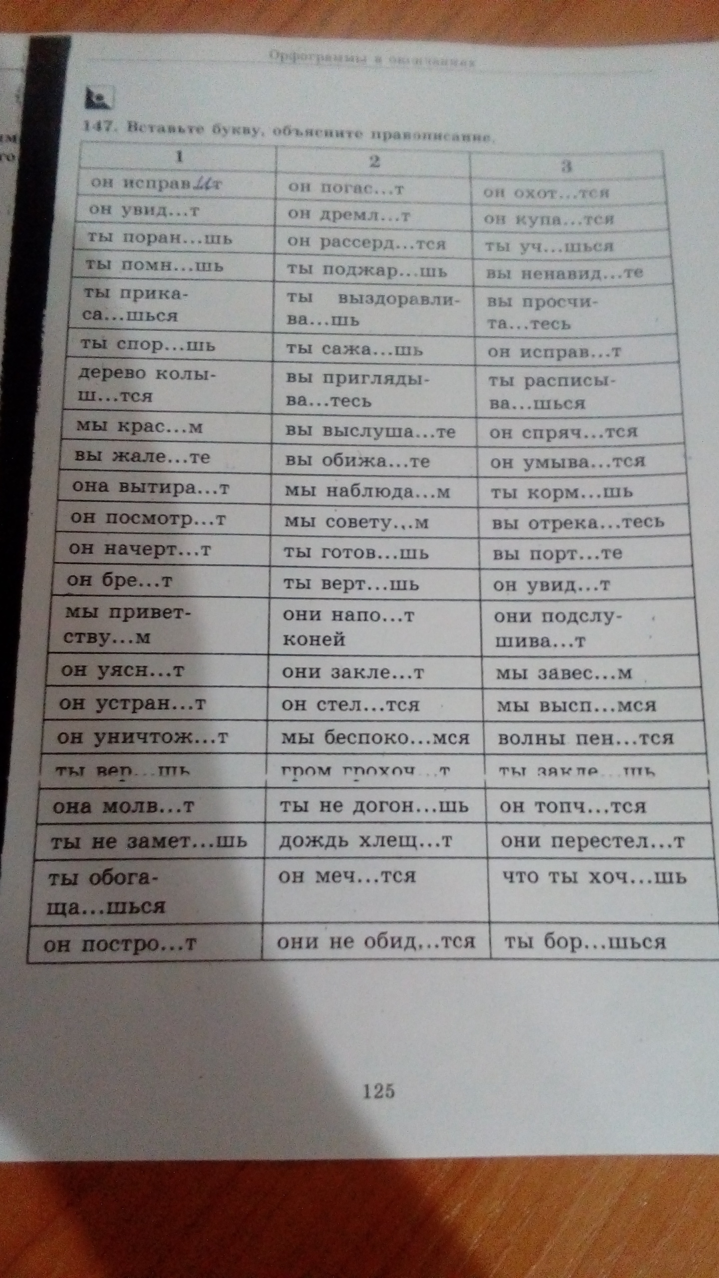 он исправит, он увидит, ты поранишься, ты помнишь, ты прикасаешься, ты споришь, дерево колышется, мы красим, вы жалеете, он вытирает, он посмотрит, он начертит, он бреет, мы приветствуем, он уяснит, он уничтожит, ты веришь, она молвит, ты не заметишь, ты обогащаешься, он построит, он погасит, он дремлет, он рассердится, ты подражаешь, ты выздоравливаешь, ты сажаешь, вы приглядываетесь, вы выслушаете, вы обижаете, мы наблюдаем, мы советуем, ты готовишь, ты вертишь, они напоят коней, они заклеят, они стелются, мы беспокоимся, гром грохочет, ты не догонишь, дождь хлещет, он мечется, они не обидятся, он охотится, он купается, ты учишься, вы ненавидите, вы просчитаетесь, он исправит, ты расписываешься, он спрячется, он умывается, ты кормишь, вы отрекаетесь, вы портите, он увидит, они подслушивают, мы завесим, мы выспимся, ты заклеишь, он топчется, они перестелют, что ты хочешь, ты борешься.