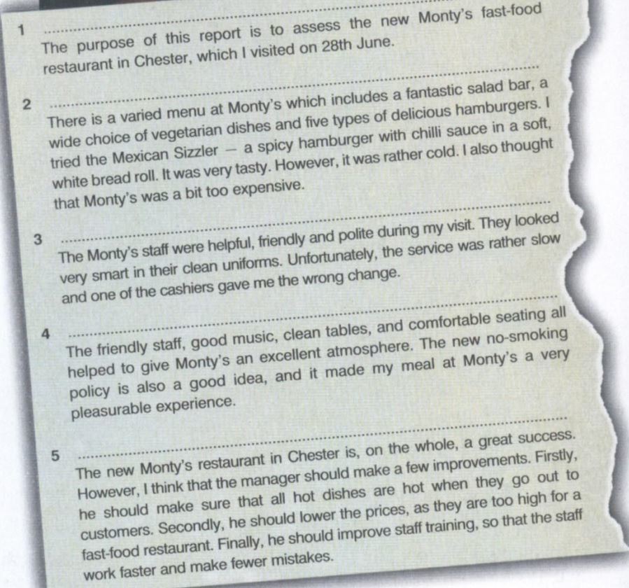 I visited Monty's fast-food restaurant in June.I liked a wide choice of delicious dishes,the friendliness and politeness of the staff,clean tables and good music.The restaurant is a great success.But I think the prices should be lower and hot dishes should be really hot.The manager should improve the staff training,too.