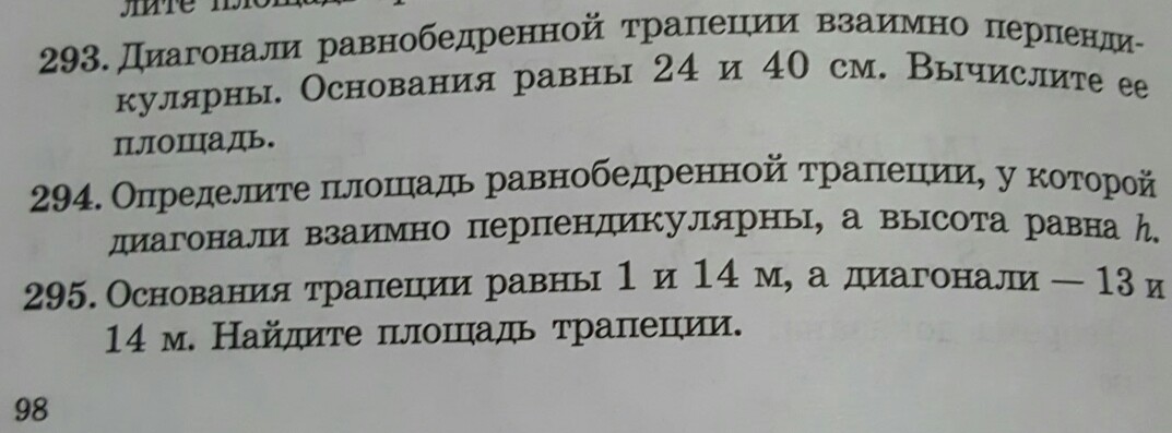 номер 293.Если диагонали равнобедренной трапеции взаимно перпендикулярны, то высота этой трапеции равна средней линии трапеции. Средняя линия равна: (24+40)/2=32(см) следовательно, высота равна 32см. Площадь трапеции равна:( (24+40):2)*32=1024 кв.см.
