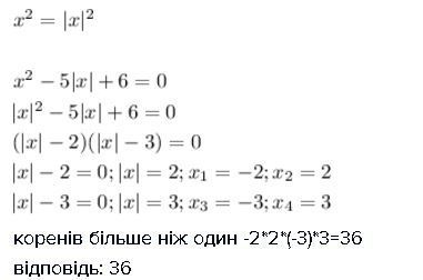 х^2 – 5|х| + 6 = 0. Запишіть значення кореня, якщо корінь один, їх добуток, якщо коренів більше, ніж один, або 0, якщо рівняння коренів не має
