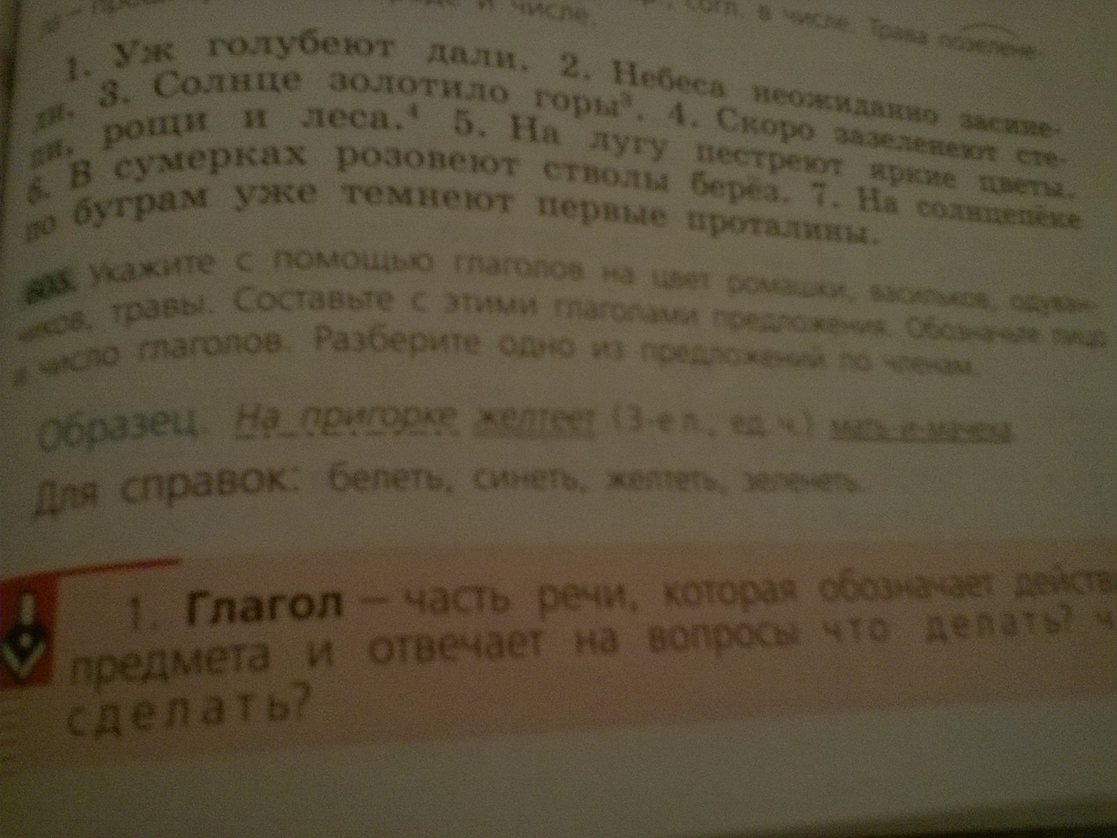 на лугу белеет ромашка, на клумбе желтеет одуванчик, в поле синеет василек, в лесу зеленеет трава