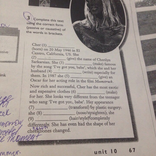 Now rich and succesful, Cher has the most exotic and expensive clothes ARE MADE for her. She looks very different from the teenager who sang "I've got you baby". Her appearance WAS TRANSFORMED by plastic surgery: she STRAIGHTENED HER NOSE, STYLED HAIR completely differently. She has even had the shape of her cheekbones changed.