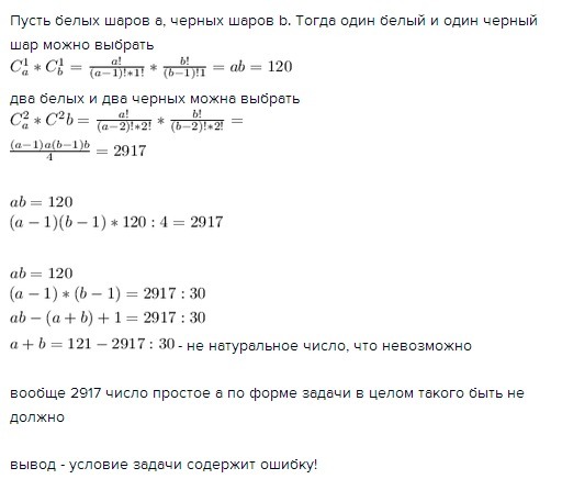 в ящике лежат белые и чёрные шары.Известно что выбрать один белый и один чёрный можно 120 способами ,а 2 белых и 2 чёрных 2917.Сколько в ящике белых и чёрных шаров?