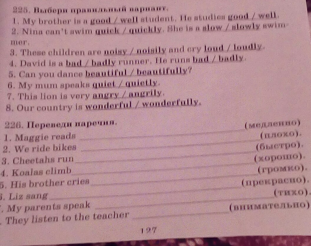 1/ My brother is a good student/ He studies well/ 2 Nina cant swim quickly/ She is a slow swimmer/3/These chidlren are noisy and cry loudly/4/ David is a bad runner/ He runs badly/5/ Can you dance beautifully&6/My mum speak quietly/7/This lion is very angry/8/ Our country is wonderful/
