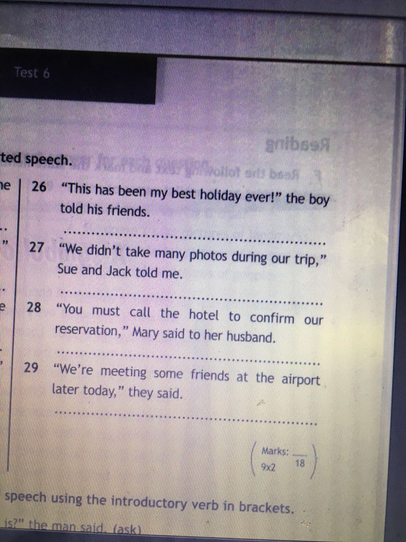 26The boy told his friends that it had been my best holiday ever/ 27-Sue and Jack told me that they havent taken many photos during our trip/28/ Mary said to her husband that he had to call to the hotel to confirm our reservation/29/ They said that they have been meeting some friends at the airport/
