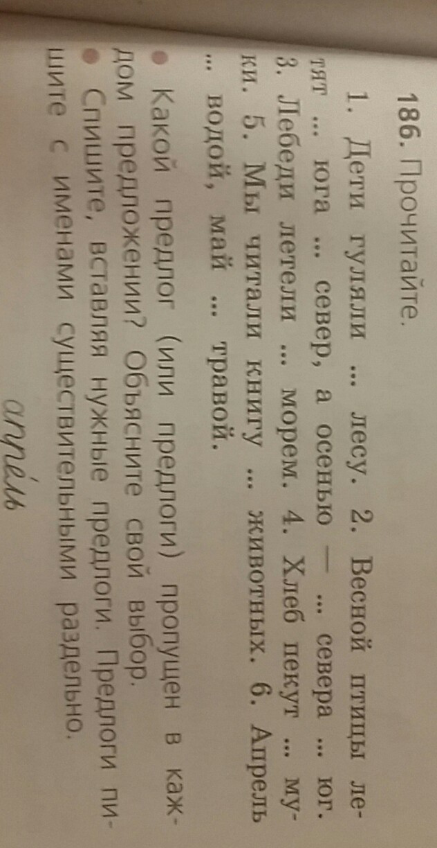 Дети гуляли по лесу. Весной птицы летят с юга на север, а осенью- с севера на юг. Лебеди летели над морем.Хлеб пекут из муки. Мы читали книгу о животных. Апрель под водой,май над травой.