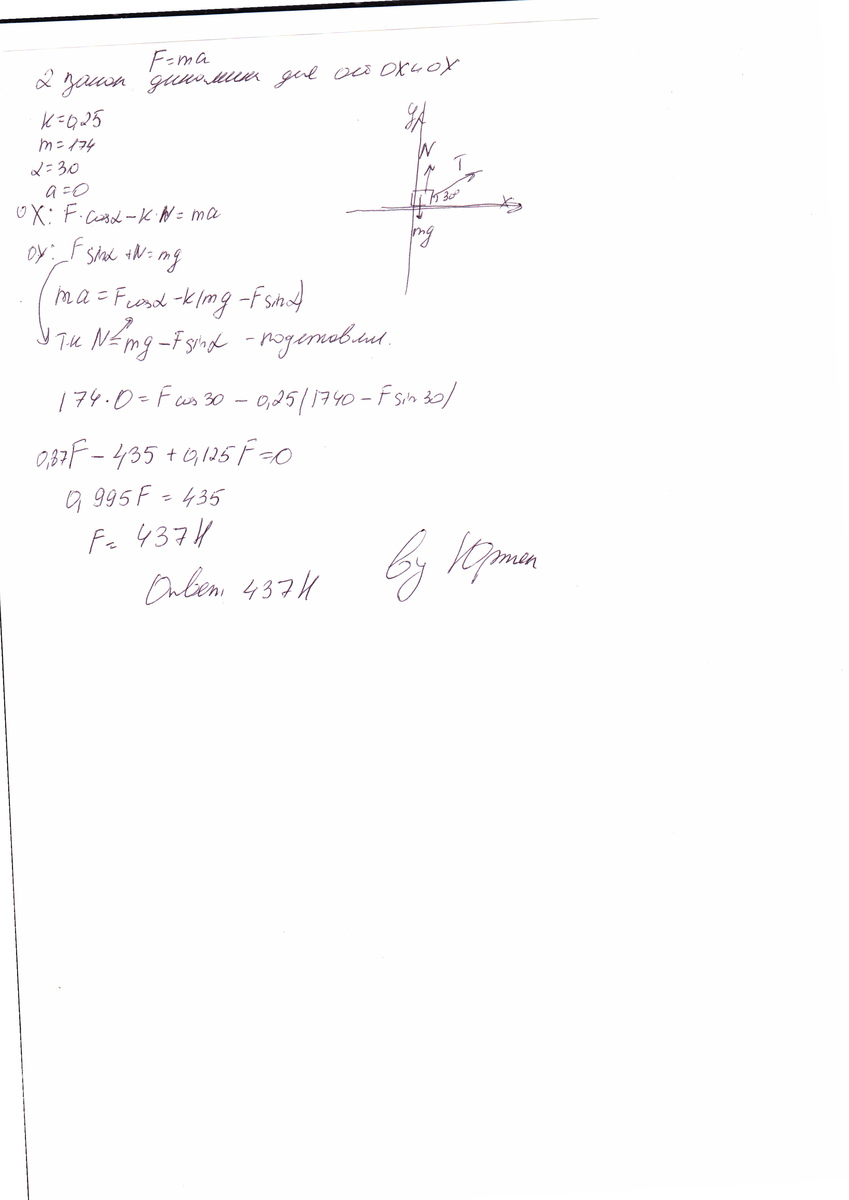 Ящик массой 174 кг тянут по полу равномерно за веревку, образующую угол 30 градусов к горизонту. Коэффициент трения ящика о пол равен 0,25.
