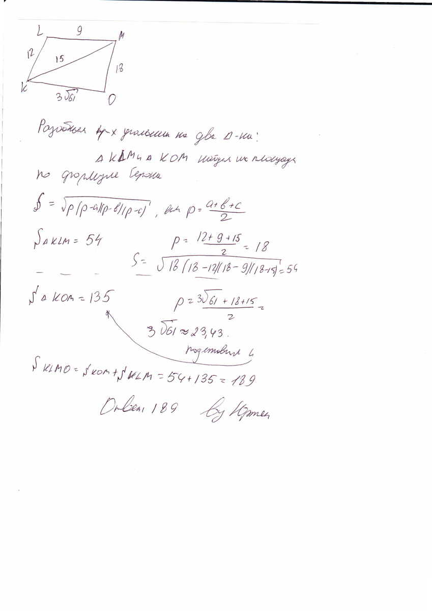 В четырехугольнике KLMO известны стороны ML=9см, LK=12см, KO= 3 корня из 61 см, OM = 18cм и диагональ MK=15см. Вычислите площадь четырехугольника.