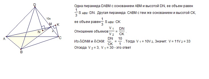люди срочно помоги мне! пожалуйста.!(( Объем треугольной пирамиды равен 33. Плоскость проходит через сторону основания этой пирамиды и пересекает противоположное боковое ребро в точке, делящей его в отношении 10 : 1, считая от вершины пирамиды. Найдите больший из объемов пирамид, на которые плоскость разбивает исходную пирамиду.
