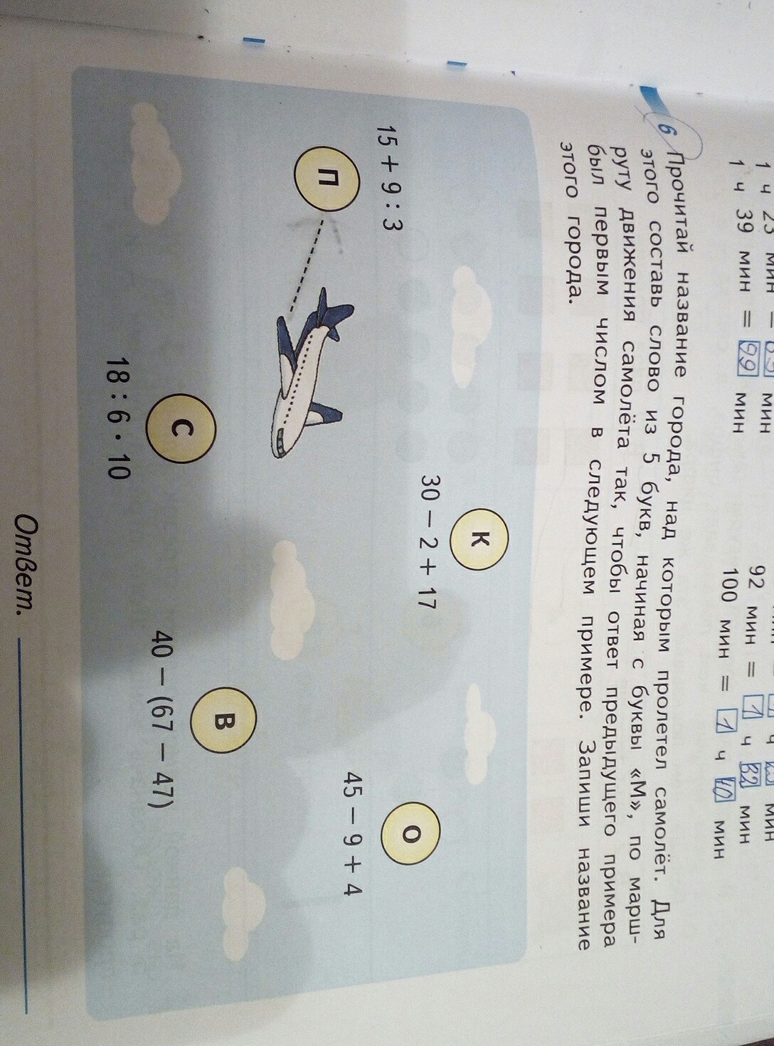 Прочитай название города над которым пролетел самолет для этого Составь слово из 5 букв начинается с буквы М по маршруту движения самолёта так чтобы ответ предыдущего примера был первым числом в следующем примере Запиши название этого города