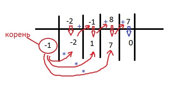 дальше, пользуясь схемой Горнера (см. рисунок), переходим к квадратному уравнению, которое решаем через дискриминант