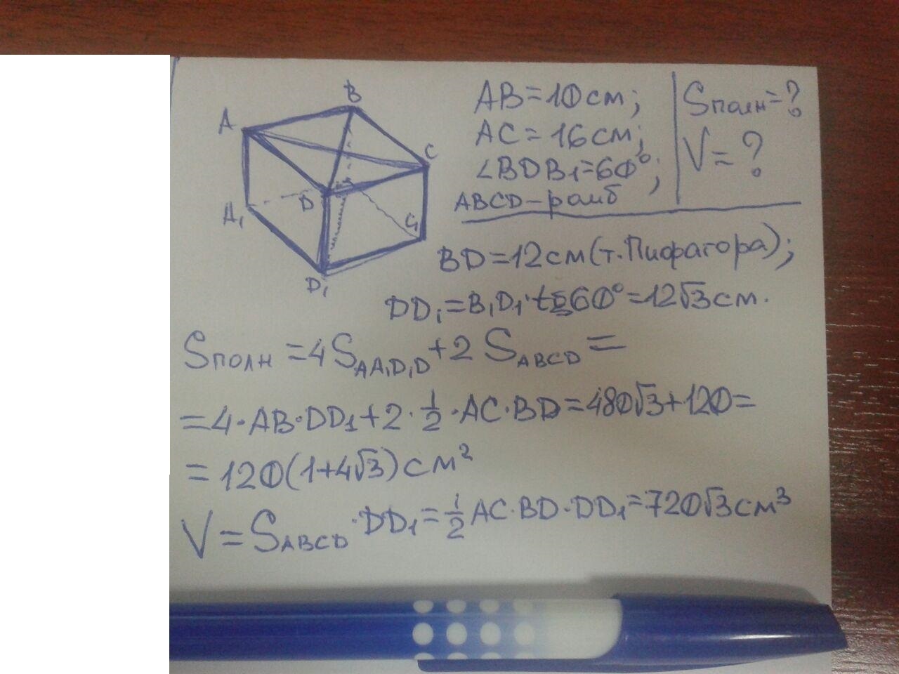 основанием прямого параллелепипеда служит ромб со стороною 10 см и большой диагональю 16 см. меньшая диагонал параллелепипеда наклонена к плоскости основания под углом 60°. Найти площадь полной поверхности и объем параллелепипеда