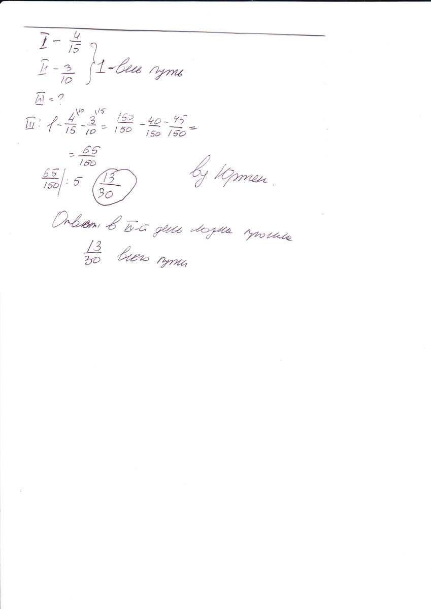 Подводная лодка шла трое суток. В первые сутки она прошла 4/15 намеченного пути, а во вторые сутки 3/10 пути. Какую часть пути прошла подводная лодка в третьи сутки?