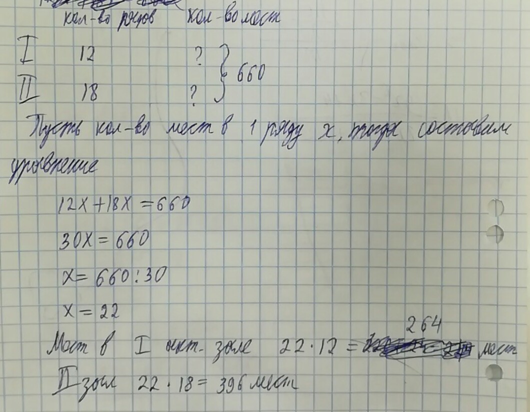 в двух актовых залах школы всего 660 мест в одном из залов 12 рядов а в другом 18 таких же рядов сколько мест в каждом актовым зале