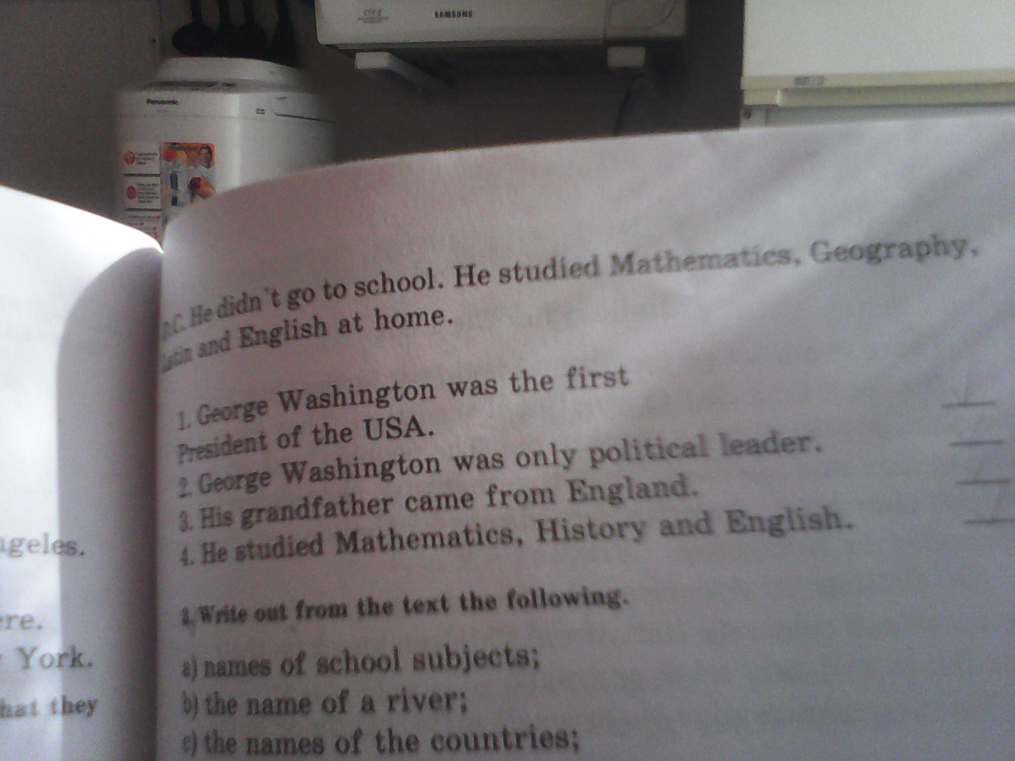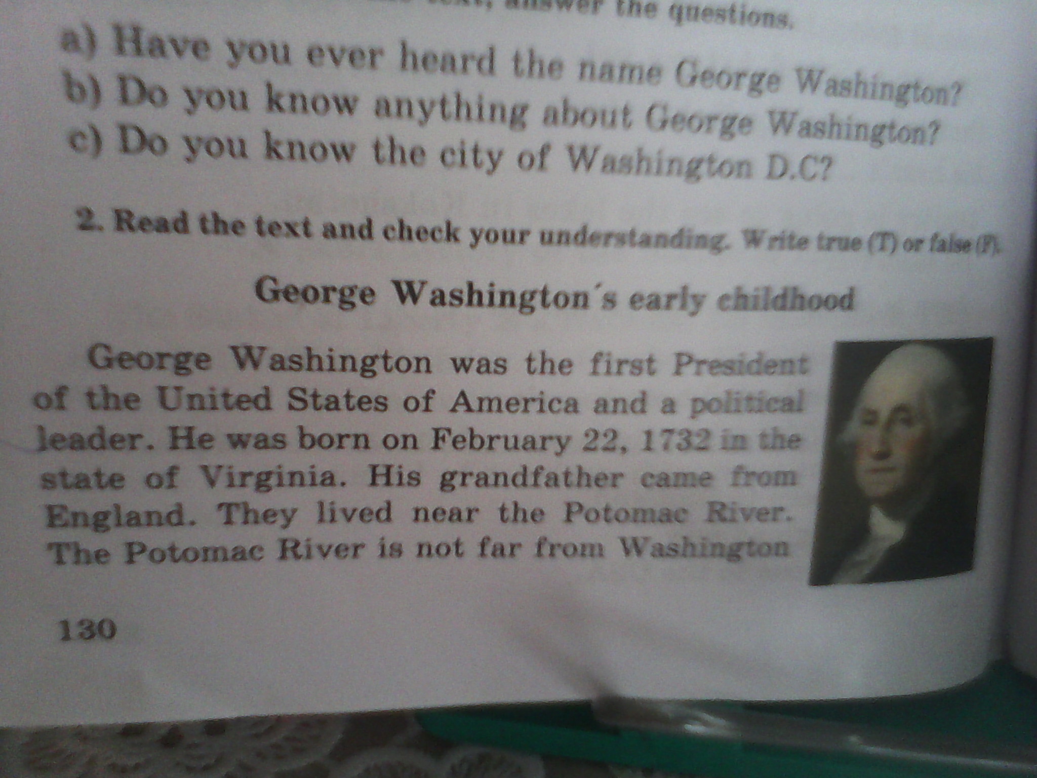 Джордж Вашингтон в раннем детстве Джордж Вашингтон был первым председателем Соединенных Штатов Америки и политическим лидером. Он родился 22 февраля 1732 года в штате Вирджиния. Его дедушка приехал из Англии. Они жили недалеко от реки Потомак. Река Потомак находится недалеко от Вашингтона. Ge не ходили в школу. Он изучал математику. География и английский язык у себя дома. Джордж Вашингтон был первым президентом политического лидера Джорджа Вашингтона, и только его дедушка приехал из Англии. Английский. Он изучал математику, историю и выписывал из текста следующее. Названия школьных предметов; Название реки: названия стран;