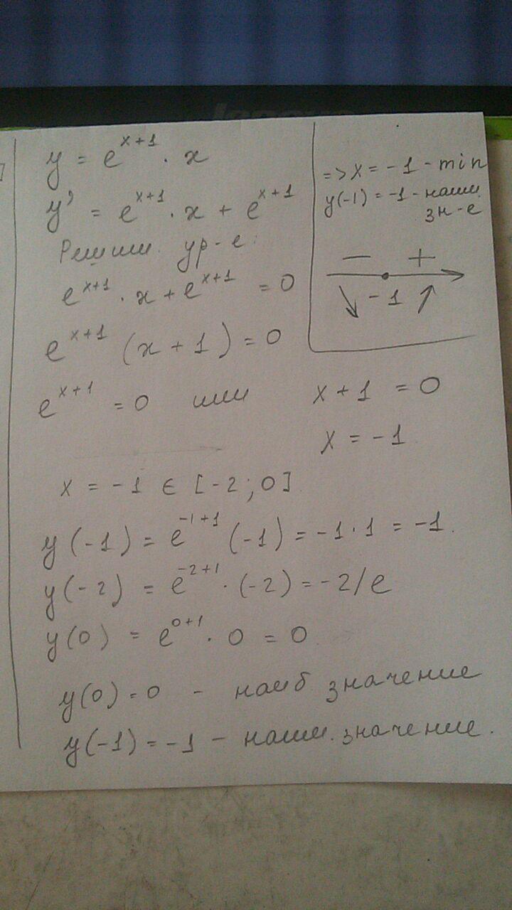 найдите наибольшее и наименьшее значение функции у = е ( степень х+1) умножить на х на отрезке [-2;0]