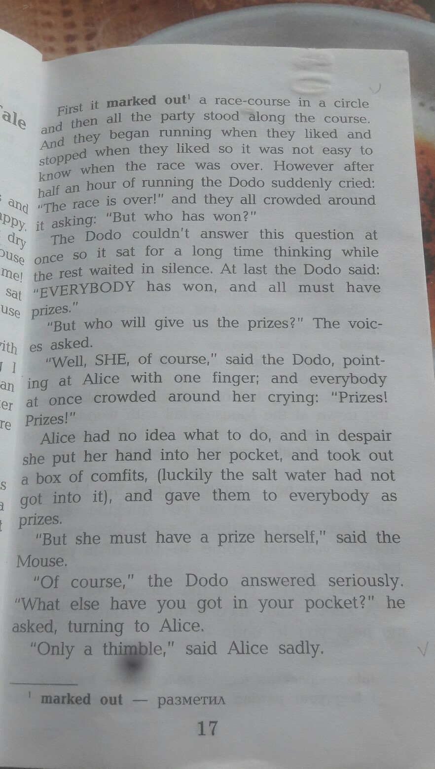 У Алисы не было ни одной идеи что делать, и в отчаянии она засунула одну руку в карман и вытащила коробку засахаренных фруктов, ( к счастью соленая вода не проникла в них), и дала их всем в качестве призов.