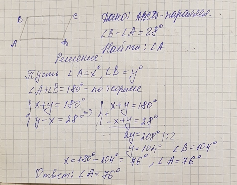 Разность двух углов параллелограмма равна 28 градусов. Найдите градусную меру меньшео из углов параллелограмма.