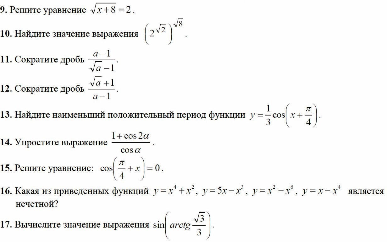 x=-4 17.sin(arcctg(sqrt(3)/3) Arcctg-это угол, значение которого равно корень из 3 на 3, следовательно выражение примет вид Sin(60)-табличное значение х=корень из 3/2