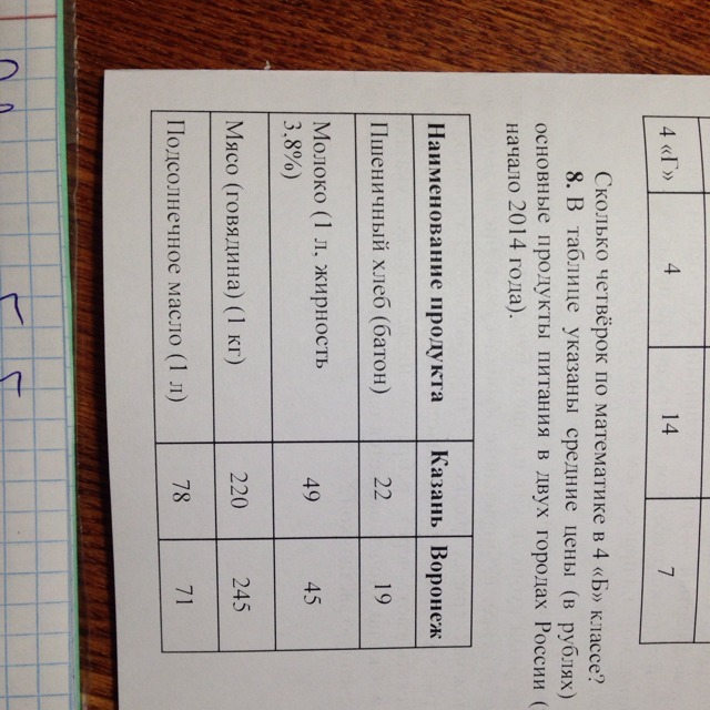 В таблице указаны Средние Цены (в рублях) на некоторые основные продукты питания в двух городах России (по данным на начало 2014 года). В каком из Городов окажется дешевле следующий набор продуктов: 1 кг мяса, 2 кг молока, 3 батона? В ответе укажи в город и и и стоимость данного набора продуктовых этом городе.
