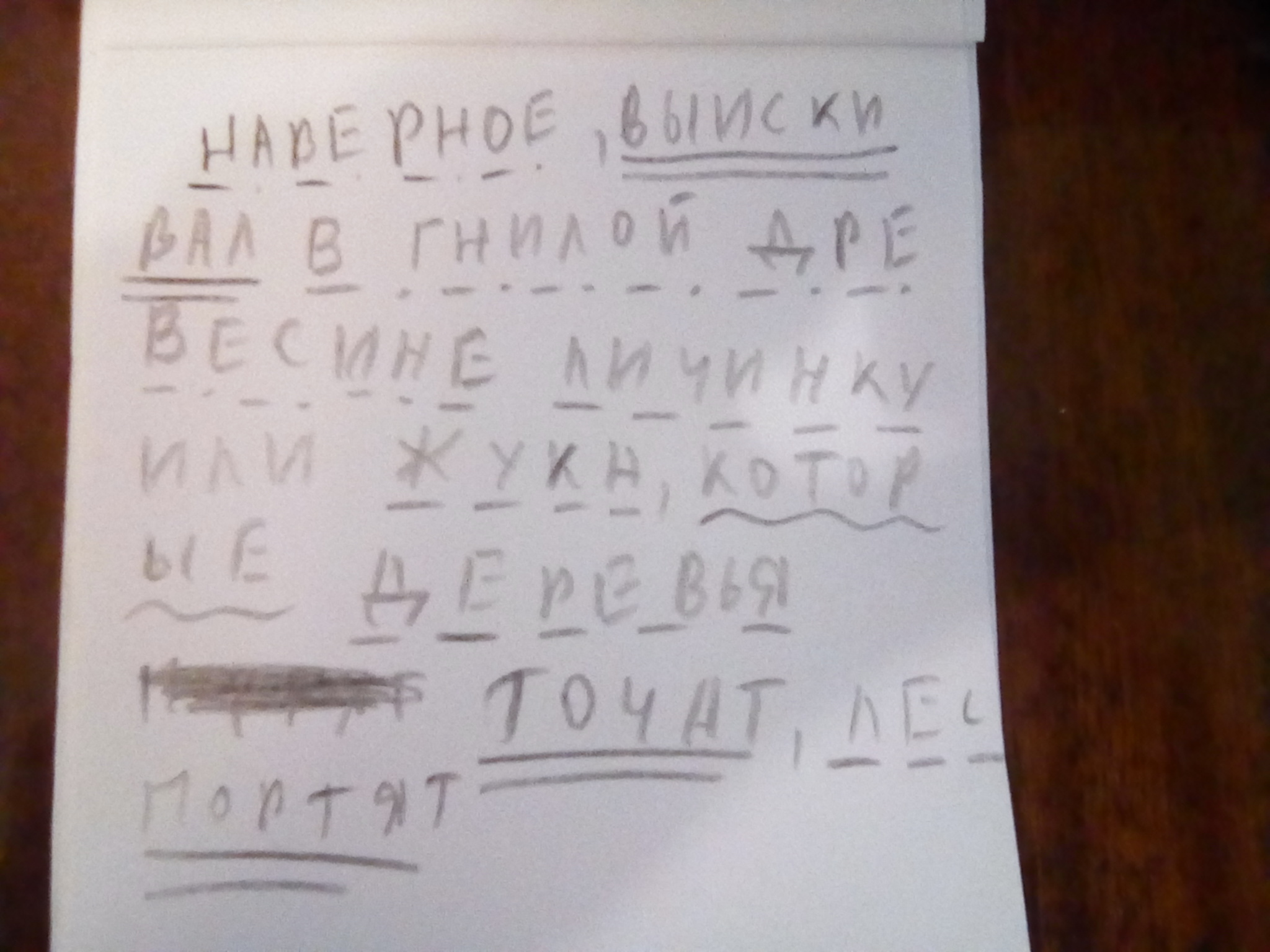 Синтаксический разбор предложения Наверное,выискивал в гнилой древесине личинками или жука, которые деревья товар,лес портят