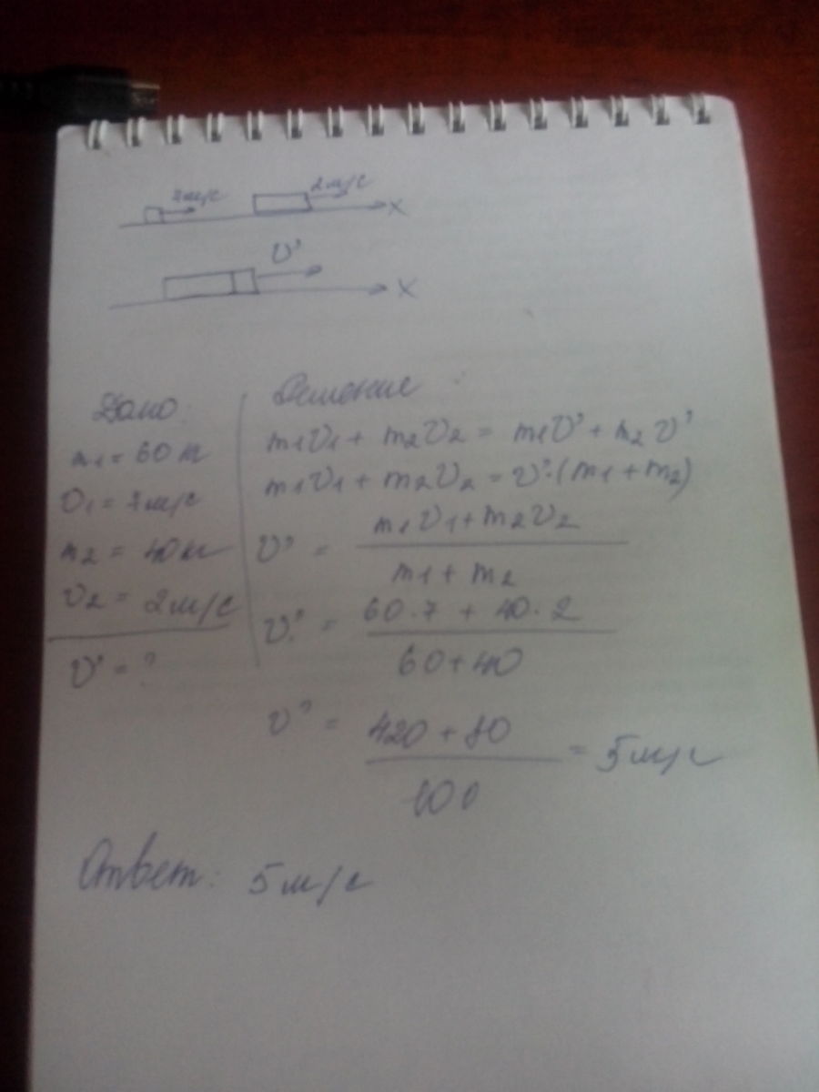 Человек массой 60 кг, бегущий со скоростью 7 м/с, догоняет тележку массой 40 кг, движущуюся со скоростью 2 м/с , и вскакивает на нее. Определить скорость тележки после этого