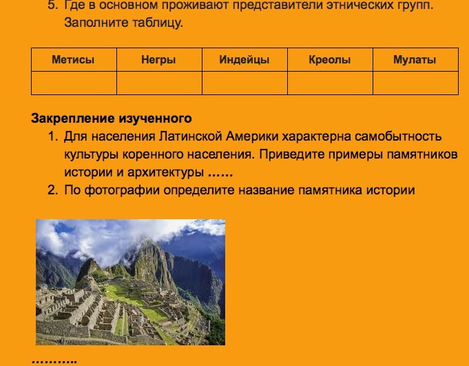 3) Индейцы. Чистые индейцы в основном живут в Андах и джунглях Амазонки. "Индейские" страны - Боливия, Парагвай и Перу, меньше - Мексика и Эквадор