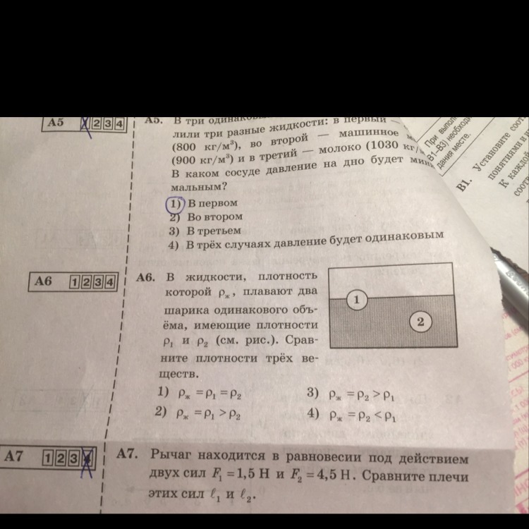 Скорее всего 3, так как плотность 1 шарика меньше плотности жидкости и он всплывает наружу. А плотность второго шарика не больше плотности жидкости поэтому он не погружается на дно, а также не всплывает наружу, значит его плотность не меньше плотности жидкости, а значит равно. Исходя из этого p1<pж, p2=pж. Ответ: pж=p2>p1
