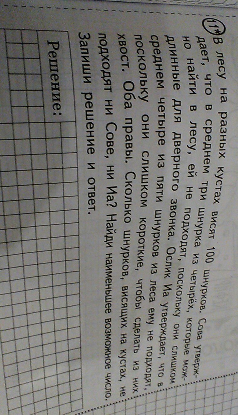 раз сова утверждает, что ей подходит только четвёртый шнурок, то 100:4=25 - столько шнурков для совы