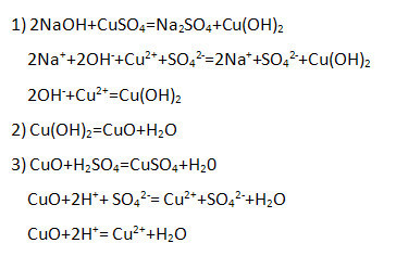 К раствору гидроксида натрия добавили неизвестный раствор голубого цвета. Выпал студенистый осадок ярко-синего цвета. При нагревании последнего цвет изменился на чёрный. К полученной смеси прилили раствор серной кислоты. При нагревании исследуемой смеси образовался прозрачный раствор исходного голубого цвета. Запишите уравнения превращений в молекулярной и ионной формах.