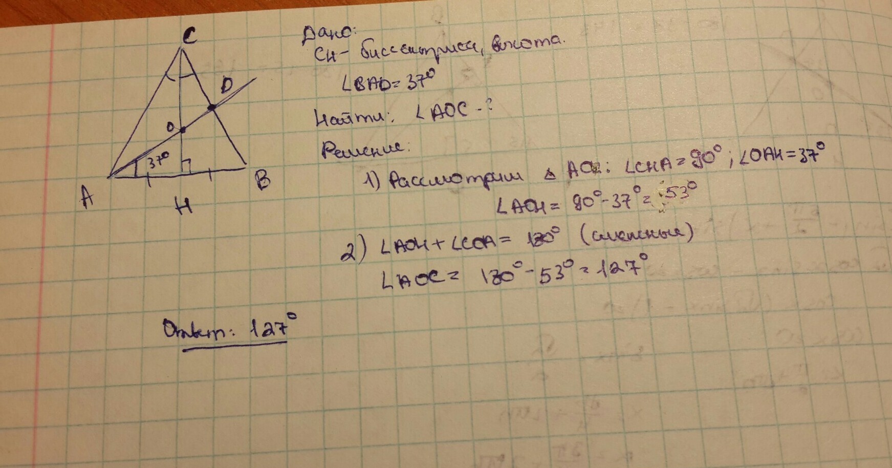 В треугольнике ABC CH-высота биссектриса, O - точка пересечения прямых CH и AD УГОЛ BAD равен 37 градусов. Найдите угол AOC. Ответ дайте в градусах