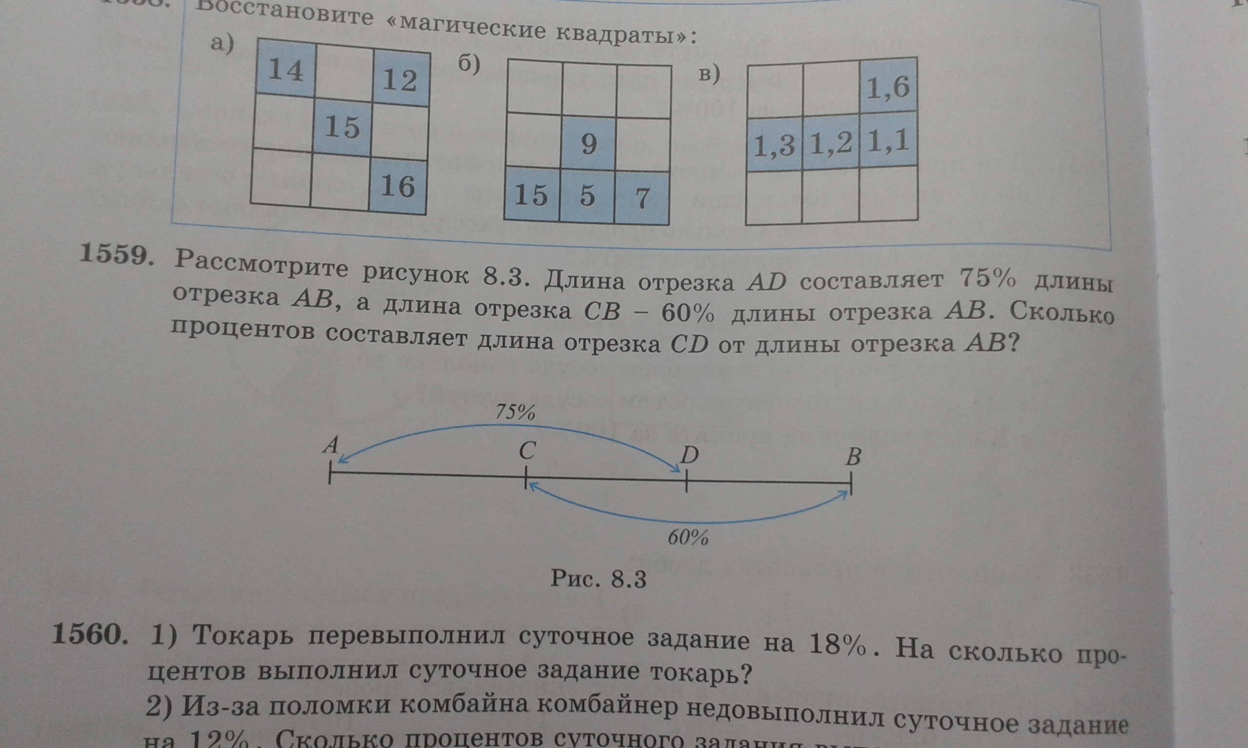 рассмотрените рисунк 8.3.Длина отрезка АD составляет 75%длины отрезка АВ,а длина отрезока СВ -60%длины отрезка АВ. Сколько процентов составляет длина отрезка СD от длины отрезкаАВ?
