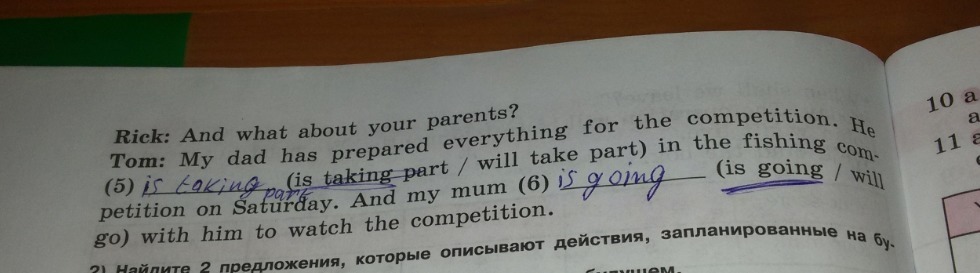 Том: Мой папа подготовил всё для соревнования. Он принимает участие в соревнованиях по ловле рыбы в субботу. И моя мама собирается пойти с ним, чтоб посмотреть на соревнование.