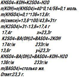 Смесь гидросульфата и сульфата калия с массовой долей гидросульфата в ней 43,9% может вступить в реакцию с 40 г 14%-ного раствора гидроксида калия. На исходную смесь подействовали избытком раствора гидроксида бария. Найдите массу осадка, образовавшегося при этом.