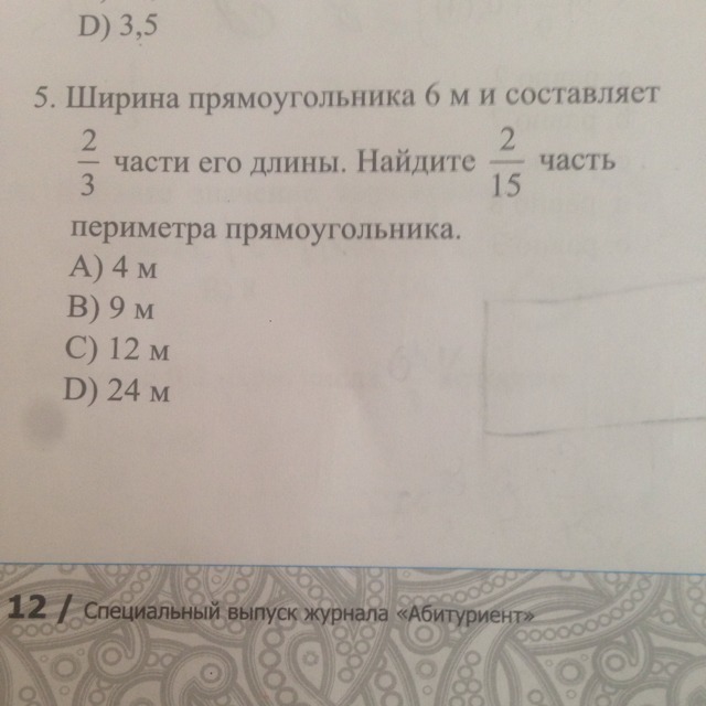 Найдем длину. 6÷2/3=6×3/2=9 периметр 6×2+9×2=30 найдем 2/15 от периметра:2/15×30=4