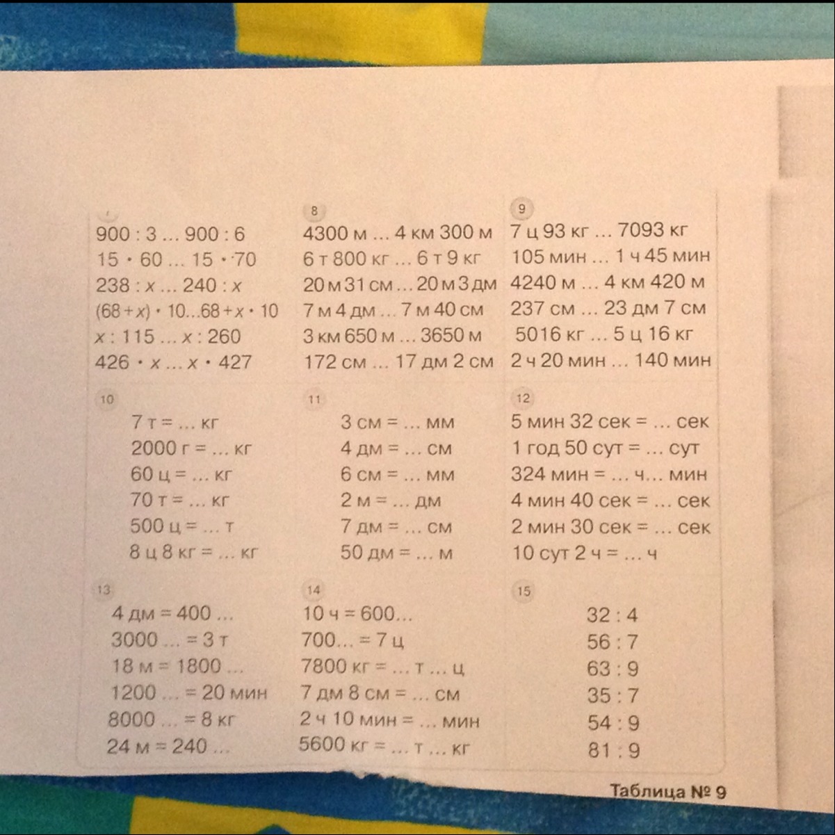 7) >, <, <, >, >, < 8) =,>,>,=,=,= 9)=,=,<,=,=,= 10) 7000 кг,2 кг,6000 кг,70000 кг,50 т,88 кг 11)30 мм,40 см, 60 см, 20 дм,70 см, 5м 12) 332 сек, 418 сут, 5ч. 4 мин,280 сек,150 сек,242 ч,13)400 мм, 3000 кг, 1800 см, 1200 сек,8000 грамм,240 см.14) мин, кг,7т 8 ц, 78 см, 130мин ,5т 600 кг 15) 8,8,7,5,6,9.