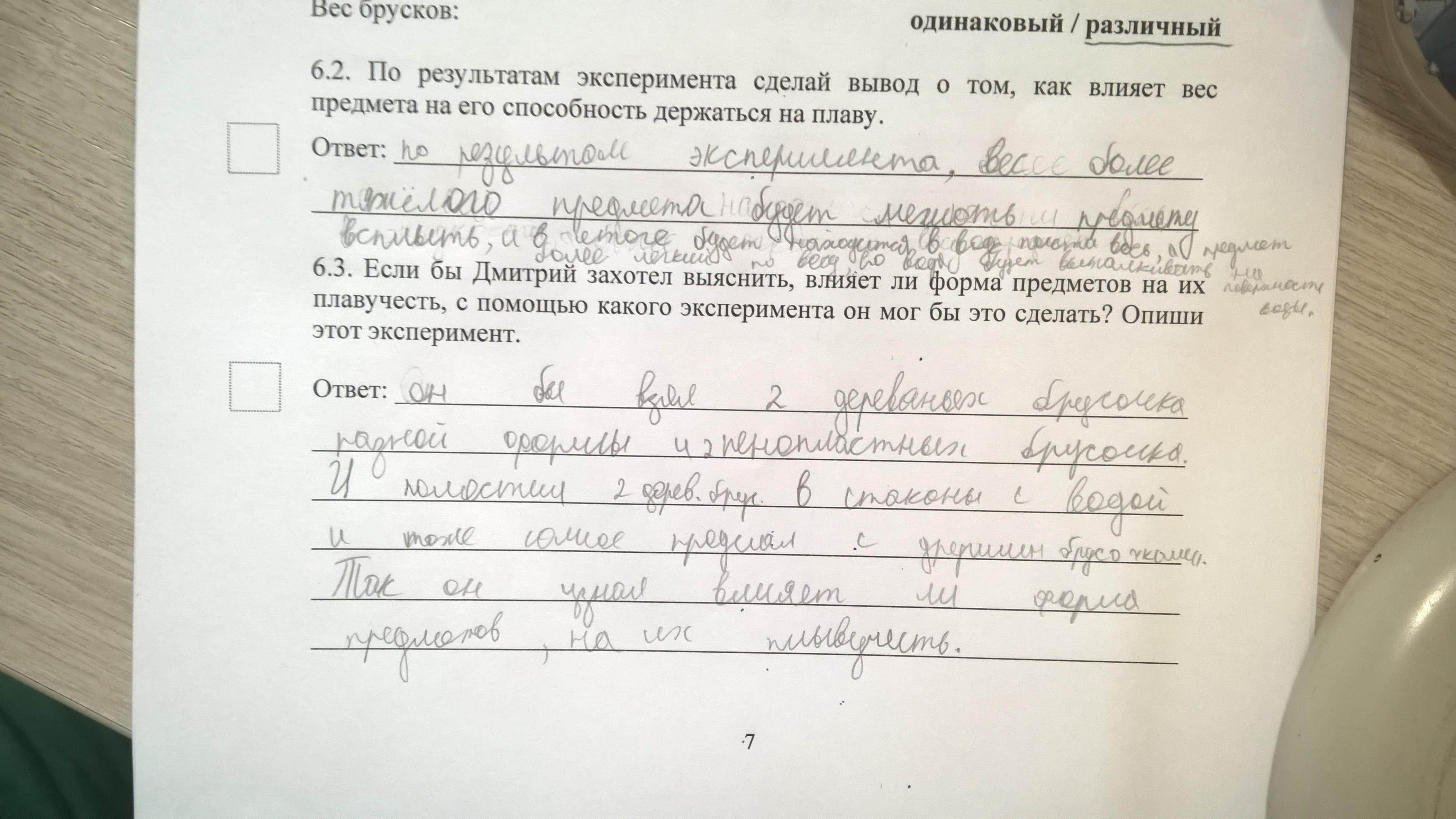 6.2. По результатам эксперимента сделай вывод о том, как влияет вес предмета на его способность держатся на плаву.