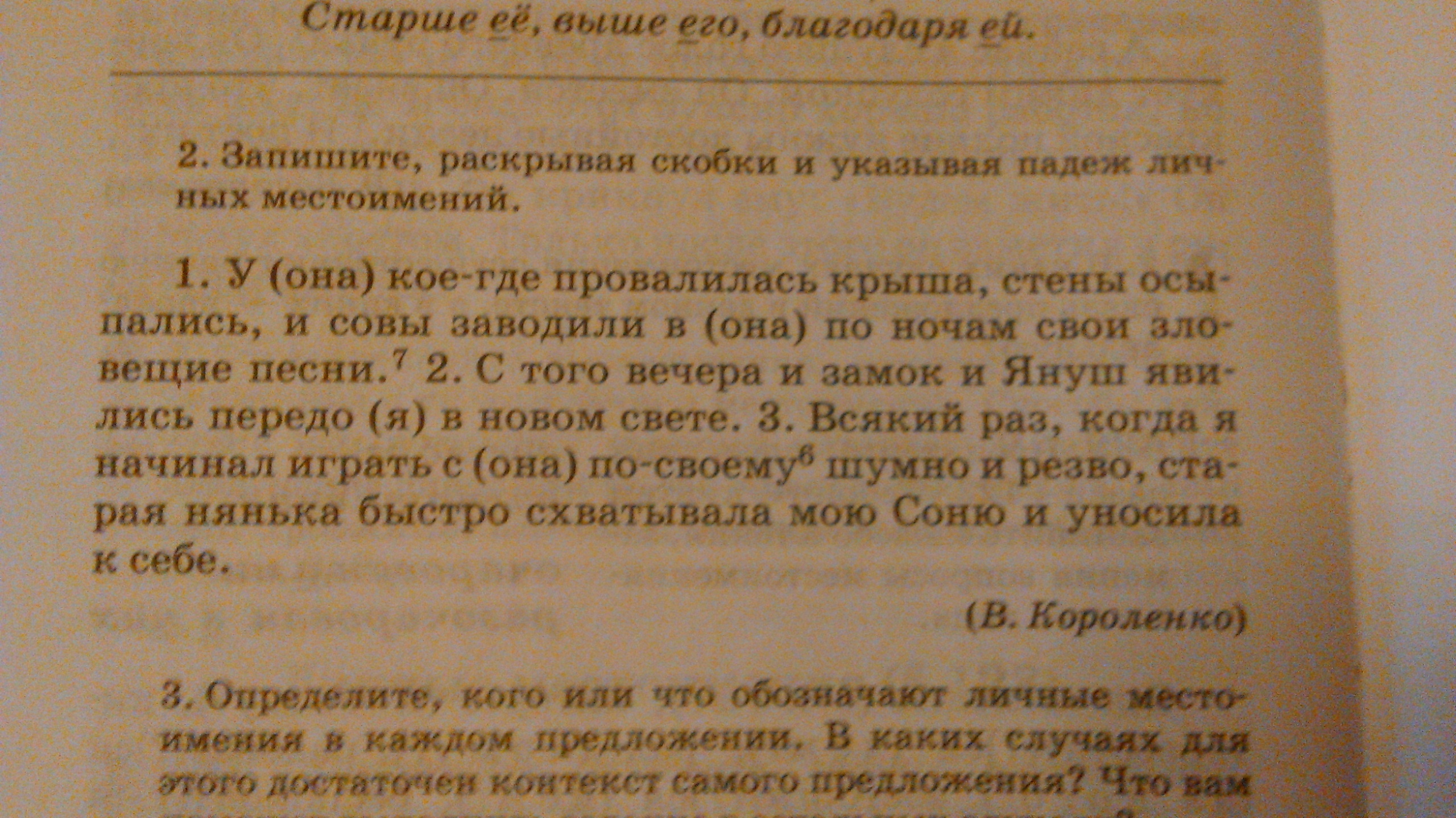 1. У неё (р.п.) кое-где провалилась крыша, стены осыпались, и совы заводили в ней (п.п) по ночам свои зловещие песни. 2. С того вечера и замок и Януш явились передо мной (т.п) в новом свете. 3. Всякий раз, когда я начинал играть с ней (т.п.) по-своему шумно и резво,старая нянька быстро схватывала мою Соню и уносила к себе.